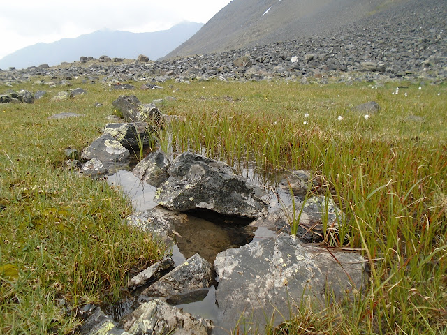 Наученные опытом вчерашней ночи, в этот раз мы подготовились к ней очень хорошо, поэтому холодно не было, а было совсем даже наоборот — жарко. Ну и пусть. Жар костей не ломит. На сегодняшний день у нас большие планы: идём в верховья Елангаша. Часть группы идёт только до водопадов, а затем возвращается в лагерь. В смысле, к машинам. Потому что всё остальное мы утаскиваем с собой. После завтрака (кстати, насколько я поняла, настоящий кофе по утрам — норма в этой компании) собирали вещи и палатки, распределяли еду по рюкзакам. Я торжественно несу булку хлеба и 2 пакета конфет. И вроде бы взяла только необходимые вещи, а рюкзак всё равно не слишком-то и лёгкий. Вот как всегда. Вышли в 11. Сегодня не жарко, а совсем даже наоборот — холодно без солнца и с ветром, потом начал моросить дождик. Идти с рюкзаком нелегко — сзади тебя всё время что-то тормозит. Вероятно, этим как раз занимается рюкзак. Голова группы идёт довольно быстро, но мы часто делаем привалы. У нас было 2 варианта поверхности, по которой идти: либо камни-курумник, либо дурацкие луговые болота или заливные луга. Вроде бы сухая зелёненькая травка, а на самом деле — болота. Лучше камни. Они хотя бы сухие.