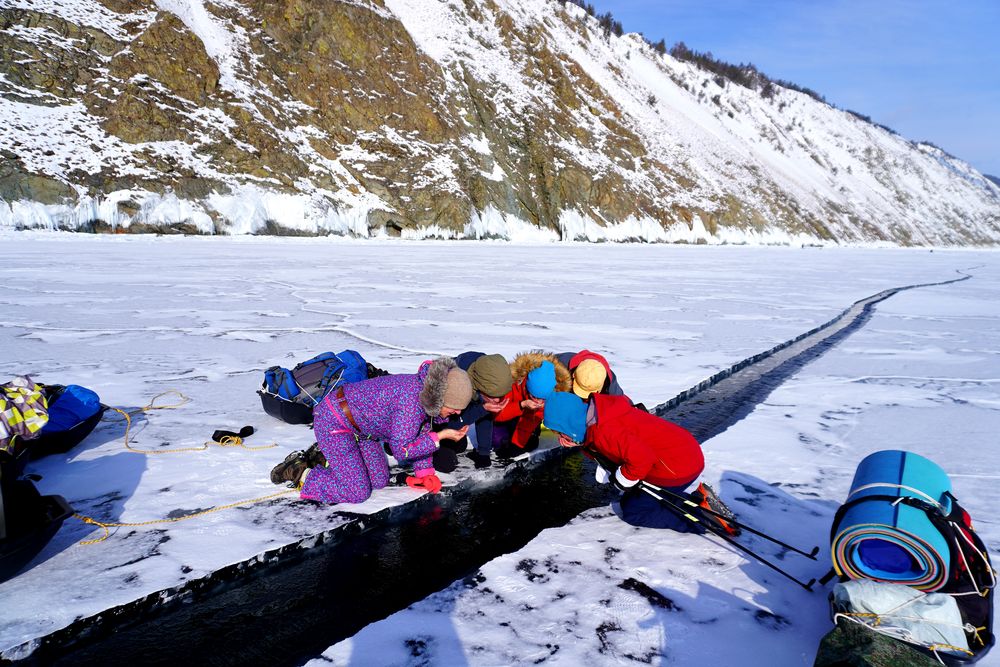 Одним из событий сегодняшнего дня стала очень длинная и порой довольно широкая свежая трещина, которая чёрной змейкой убегала куда-то в горизонт. Мы не только постоянно переправлялись с одного берега трещины на другой, но и вдумчиво пробовали её на вкус — а вдруг кем-нибудь станем после этого? Только бы не козлёночком. Кроме того, нас очень заинтересовал подводный мир. Это в летнем походе такого добра сколько угодно, а в зимнем-то — настоящая экзотика! Правда, рыбов нам так и не показали, как бы старательно мы ни пялились в толщу воды. Увы и ах.