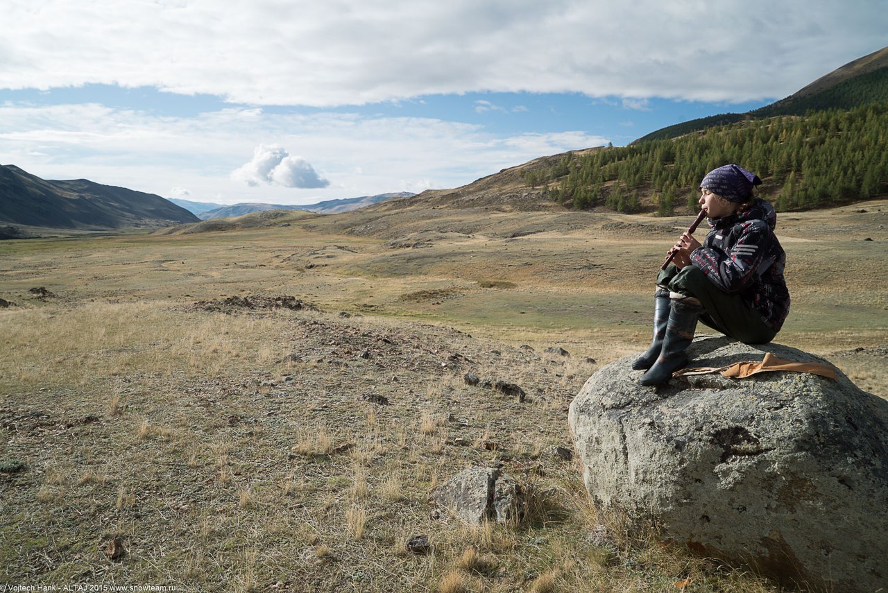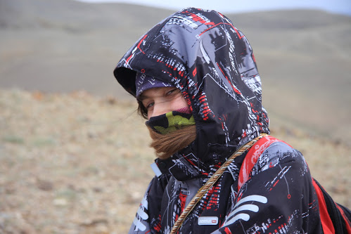 Сегодня я проснулась в 6:15, из-за того что Дима и Марина шушукались. В 6:30 мы стали петь песню “Ветер перемен”, а Яха поглядывал на нас из спальника, как на сумасшедших. Ночью шёл снег, а я опять всё проспала. Когда вылезла из палатки, с тента посыпался снег. У меня случился поросячий восторг, и я стала носиться с визгом, напевая при этом “Снег идёт из дырки в небесах” Несчастного случая. Спала я, кстати, в лыжной куртке. Потом мы с Мариной гуляли и разговаривали. По возвращению закидали палатку со Славой снежками с воплями “Какой крупный снег!”. Он не отозвался. Потом Войтех снял на видео, как я играю “Песню кондора” в степи.