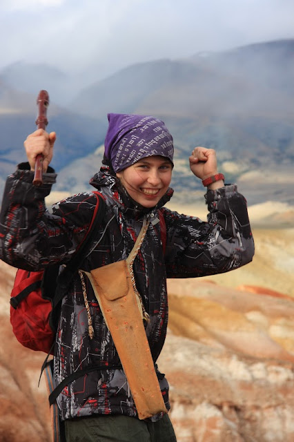 На завтрак была овсянка с бананом. Как ни странно. После завтрака как обычно: сборы, отъезд. Ехали часа 2.5-3. Внезапно уехала Марина, что было очень грустно. На той останвке мы с Яхой купили вредной гадости и сгущёнки. Слопали враз. И ещё хачапури. Потом я ушла в гости в другой уазик и ехала там. Из-за плохой погоды решили сегодня не идти к леднику, а погулять вокруг. Место стоянки было не очень уютным, но зато мы были там одни. По приезду мы принялись судорожно собирать палатки. Накрапывал дождик, и дул ветрюган. Яха сегодня творил какую-то фигню, поэтому я его отправила куда подальше, и помогать мне ставить палатку пришёл Слава. После того как палатка была поставлена, а вещи разложены, я решила пойти погулять, дабы не мешаться. Прошла немного вниз по течению, увидела прикольную жёлтую горку. Забралась туда и увидела Славу, который демонстративно чесал куда-то вверх. Я решила, что это не дело, и почесала за ним. Учесали чёрти-куда, но оттуда открывался такой обалденный вид!! Горы в красную и жёлтую горизонтальную полосочку, вдалеке они фиолетовые и прикрыты облаками; видны лучи солнца, проходящие сквозь облака. Офигенно!
