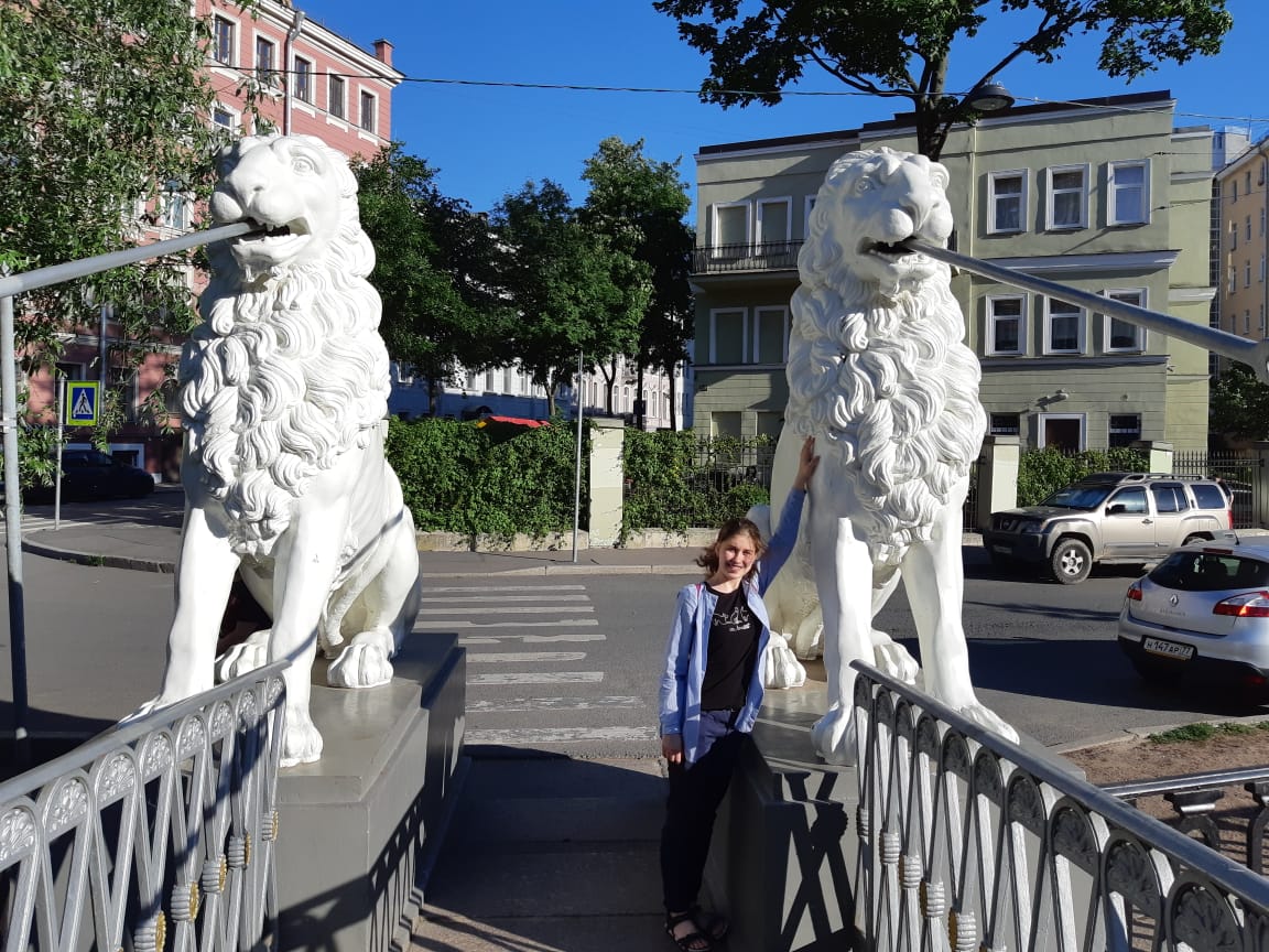 После обеда мы заселились в гостиницу без чемодана. То есть они заселились, а я пришла в гости. Отдохнув часок, мы отправились исследовать мостики Грибоедова канала. Нашли любимый мостик Куки – Львиный мост – и красиво пофотались.