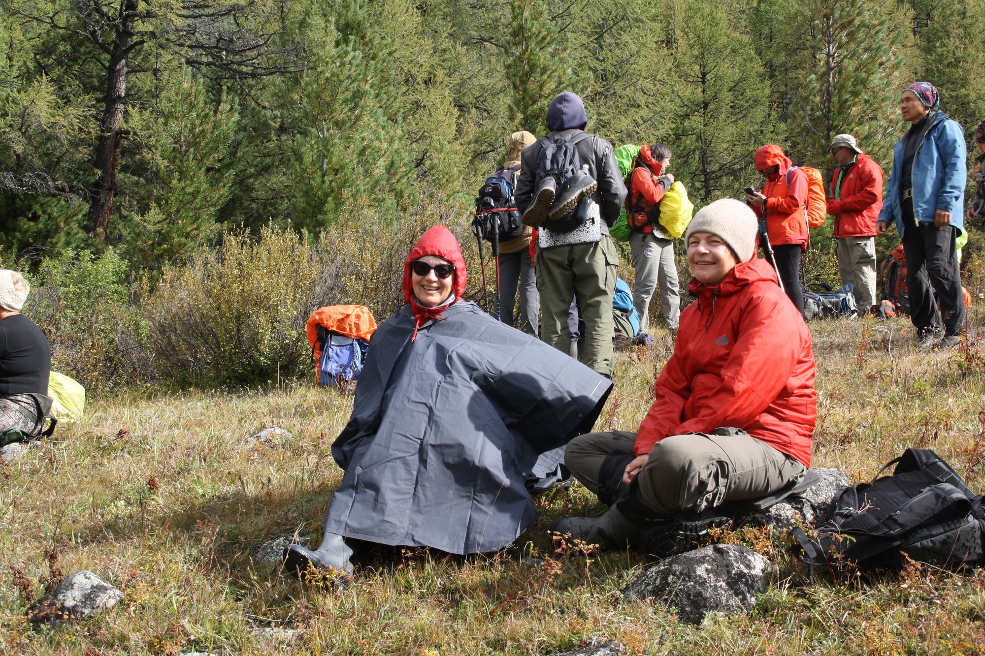Для обеда расположились на огромном, покрытом мхами и лишайниками валуне. Сидели, нахохлившись, и на радостях пели «Полгода плохая погода, полгода совсем никуда…», чего в хорошую погоду мы себе никогда не позволяем. Во избежание. Та самая Непогодь не дала долго рассиживаться и очень быстро погнала нас дальше по тропе. Шли достаточно легко, но была небольшая проблема: невозможно было понять, жарко тебе в данный конкретный момент или же, наоборот, холодно. Не говоря уж о том, чтобы выбрать адекватно соответствующих температурным ощущениям наряд.