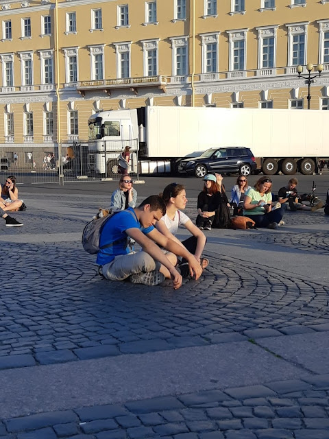 После Летнего сада мы сходили к Атлантам и потусили на Дворцовой площади, послушали Цоя и Наутилус-помпилус, сидя прямо на мостовой.