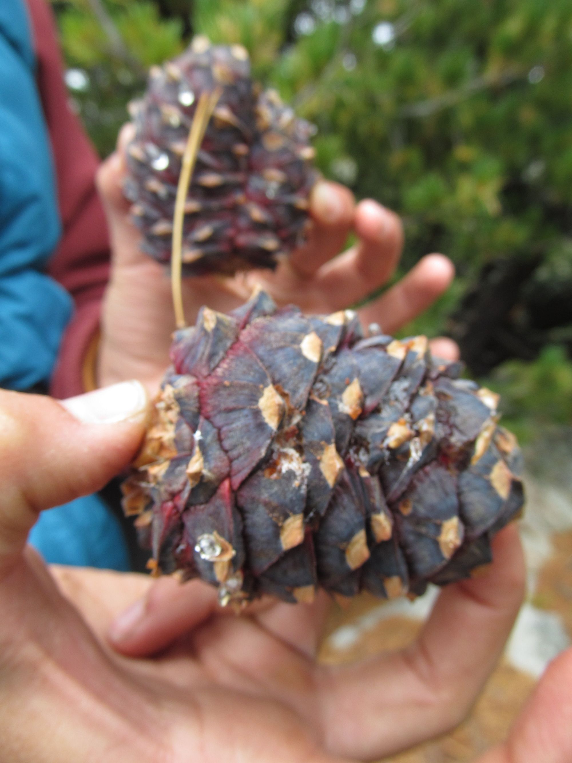 Тропа начиналась у самой воды, а затем поднималась всё выше и выше, вилась между величественных кедров и огромных холодных валунов, покрытых мягким одеялом мха и плоскими ладошками бадана. Мы пособирали кедровых шишек — я пришла в абсолютно детский восторг, когда сама сорвала шишку с пушистой ветви кедра.