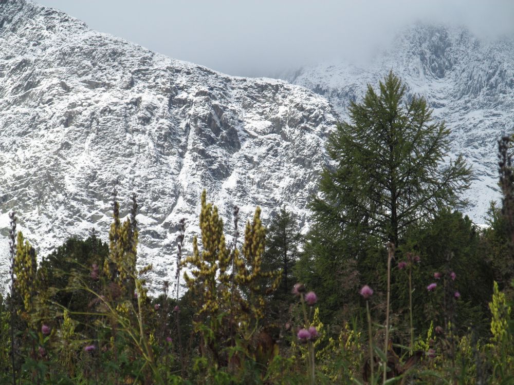 В половине седьмого утра Ира распахнула полог палатки, и её громкое «ой, девочки, вы только посмотрите на это!» мигом выдернуло из сладкого сна всю нашу палатку № 6. А на улице действительно было настоящее «ой». С неба мягкими пушистыми хлопьями падал снег, тихо и уютно шуршал по палатке, одеялом укутывал землю, кусты, а также опрометчиво разложенные на просушку носки. Явственно пахло ноябрём. Вот вам и 19-е августа… Общая картинка в голове складываться категорические не желала — разрыв шаблона был полнейший. Где-то в тумане, припорошённые снежим снежком, паслись безмолвные лошадки, под кедром спал, свернувшись поплотнее калачиком, пёсель Тунгус. Над озером и над Кара-Алахой поднимался пар, бесчисленные снежные мухи неслышно падали в воду и тут же таяли, растворялись в ней. Свежепобелённые горы заметно посуровели и приобрели вид очень непреступный. Вдоль реки бродила непривычно притихшая мокрая Ира, которая полагала, что будет апрель. Более того, она была в этом уверена. Хорошо ей! Я вот уже ни в чём не уверена, например.
