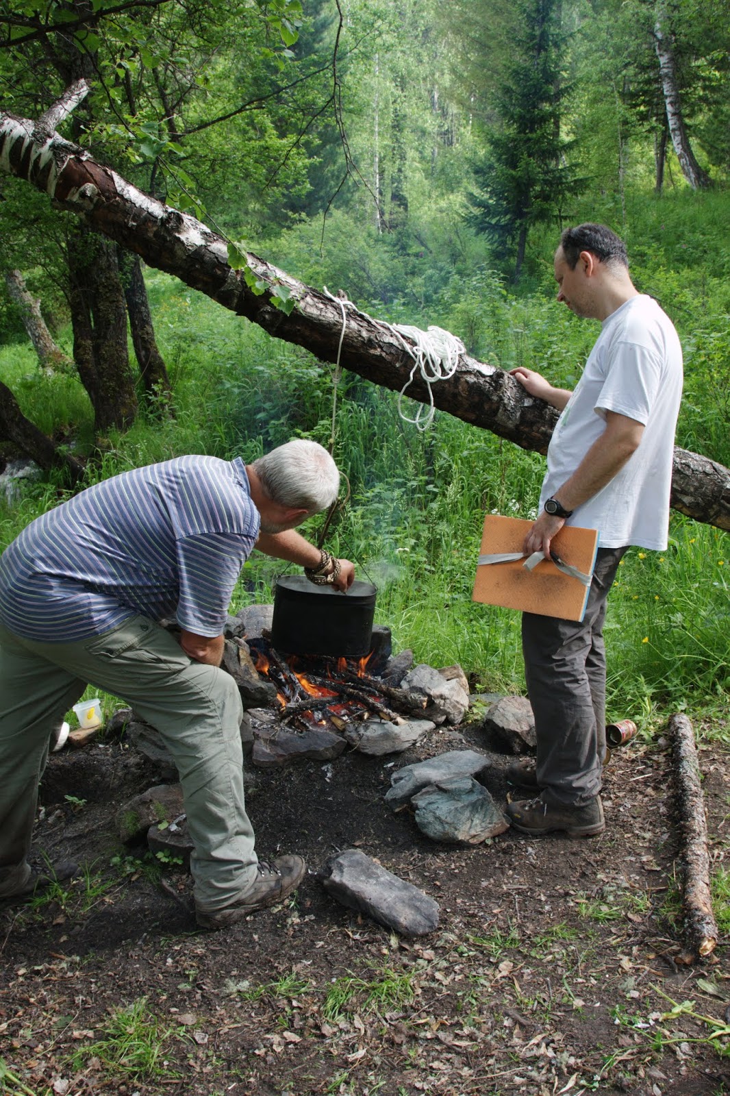 Т. Маша ушла встречать Яху. Пришли Наташа, Тёма, т. Маша, Яха, Дима и Андрей. И каждого я встречала хором “Славься” на дудке. На перевале у нас был обед. Скорее перекус: хлеб, сало, огурцы, яблоки, шоколад, сметана и т.д. Было вкусно. Стали спускаться. Спускаться было легко; я шла с т. Машей, и мы разговаривали. А Яха шёл с Артёмом, и они обсуждали комп. Спустились на удивление быстро. И наконец-то там был ручей! Мы пили чай.