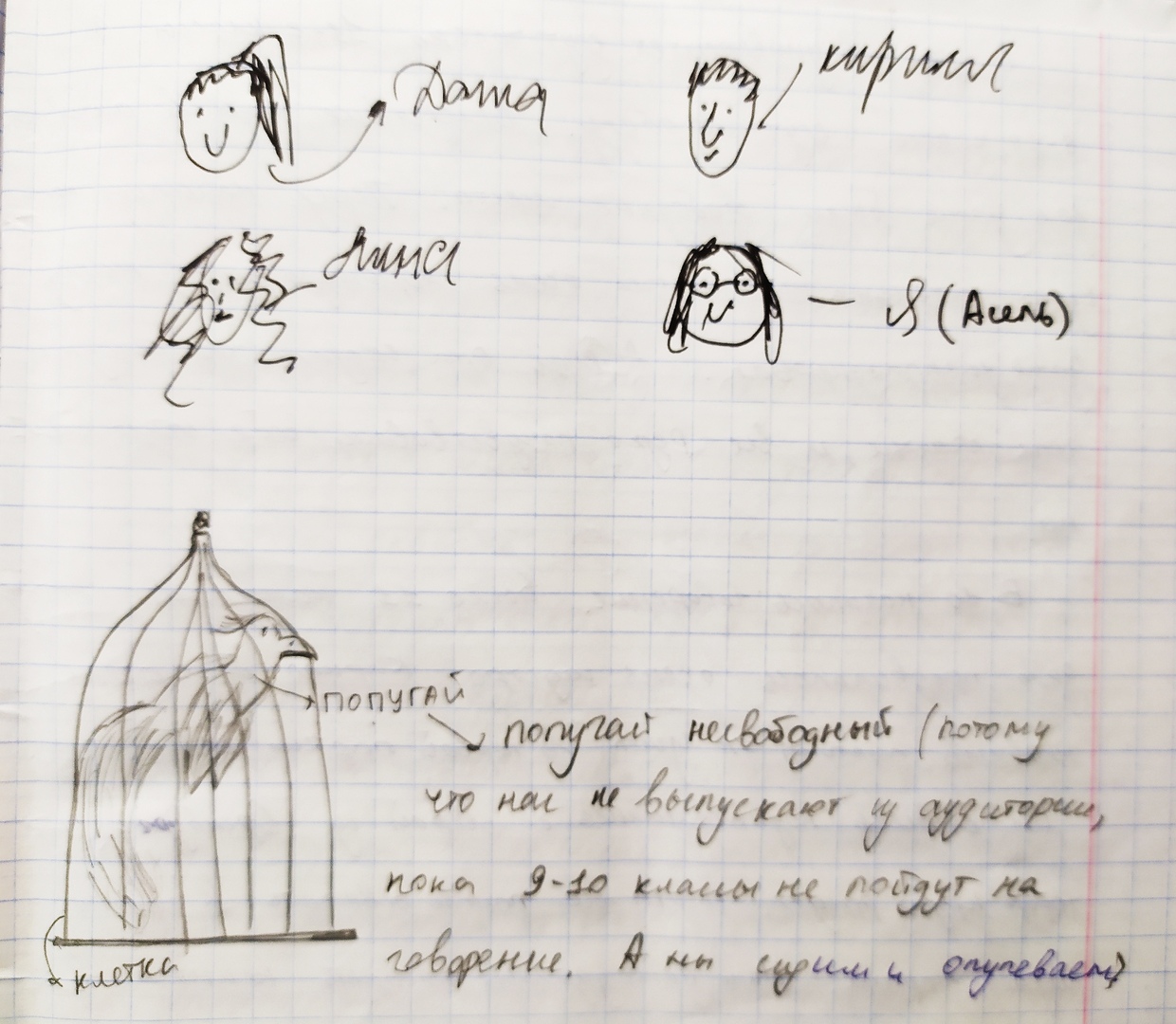 | Попугай несвободный, потому что нас не выпускают из аудитории, пока 9-10 классы не пойдут на говорение. А мы сидим и опупеваем |