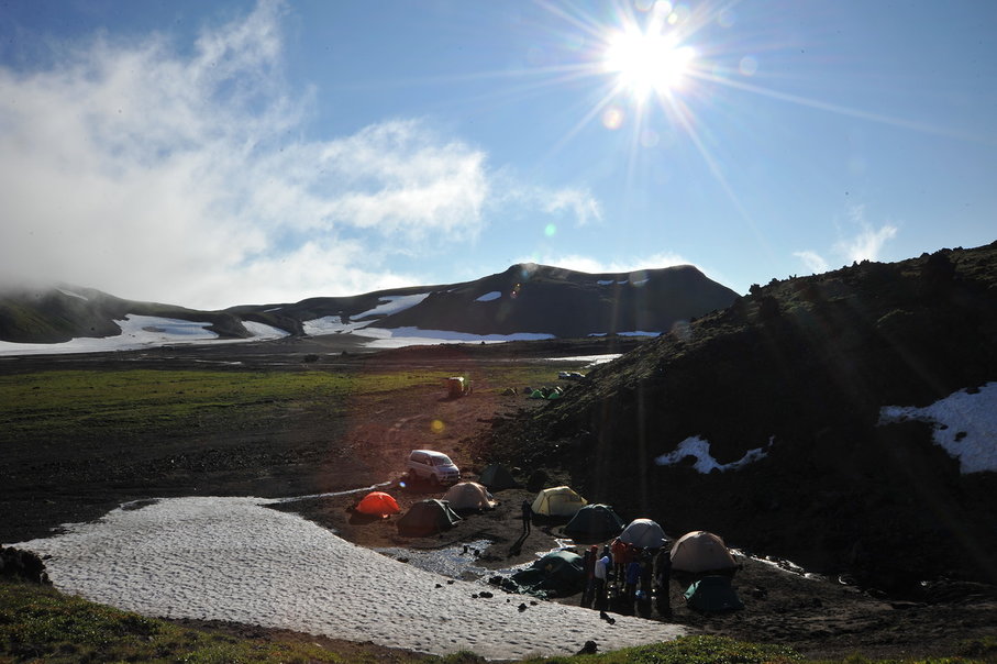 В лагере выяснилось, что половину палаток подтопило снизу из-за тающего на солнце снежника, а ещё их активно сдувало.