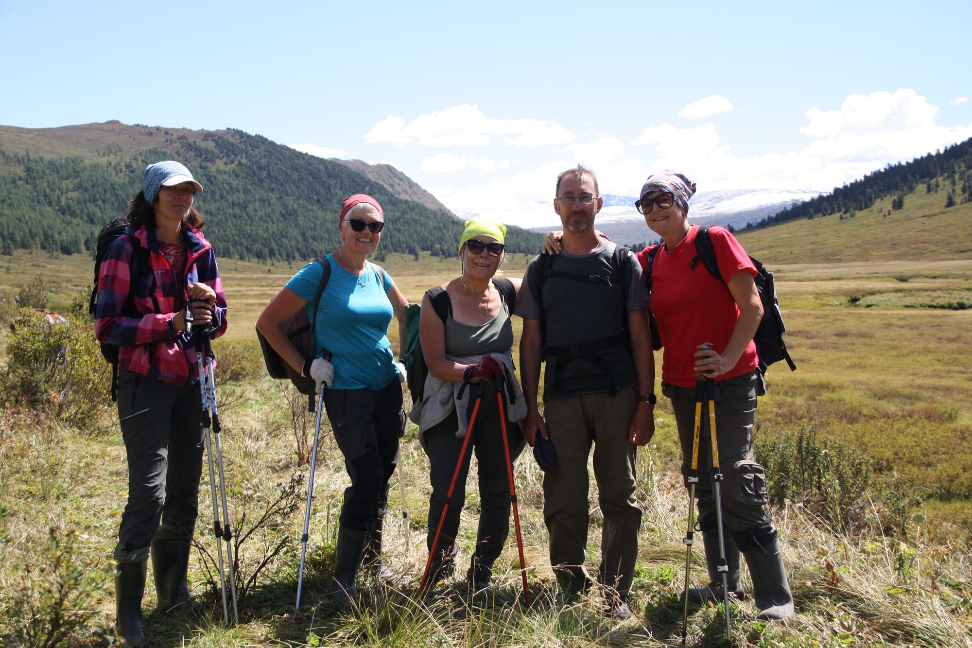 Однако километры эти не были какими-то особенно сложными и выматывающими, потому как идти по этому шикарному шоссе было одним сплошным удовольствием: ровненько, лёгкий уклончик вниз, ни тебе курумника, ни нашей любимой берёзки, и лишь изредка встречались заболоченные участки. Можно было в кои-то веки смотреть не под ноги, а по сторонам: любоваться на уютные покрытые разноцветным ковром карлушки и поросшие разлапистыми пушистыми кедрами холмы, на облака всех возможных форм, текстур и размеров.