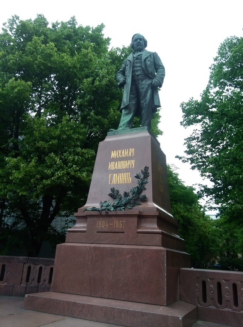 Потом были птички. МНОГО птичек. Разные птички. Потом обитатели степей, пустынь, тундры, тайги, тропических лесов, прибрежных скал и других возможных экосистем. Было представлено много витрин а-ля “в естественной среде обитания”. Занятно. В конце были мамонты, носороги, бегемоты, жирафы, слоны, лошади, верблюды, белые, чёрные и бурые мишки, большие дикие кошки, тапиры, музавьеды, косули, олени, маралы, лоси и много ещё кто. Всех не упомнишь, не перечислишь. Я пробыла в музее 3 часа и не успела всё посмотреть и про всё почитать. Под конец моя голова приняла абсолютно идеальную квадратную форму. Выйдя из музея, я нашла очень милый парк, в котором стоит колонна РУМЯНЦЕВА ПОБЕДАМЪ, и немного там отдохнула. После этого перешла на обратный берег Невы и направилась в сторону консерватории, надеясь, что её уже закончили реставрировать. Мне было обещано, что в Спб красивая конса. А вот фигушки. В смысле, может быть, она и красивая, но вся в лесах, так что непонятно. Зато я нашла памятники Глинке и Римскому-Корсакову, а также Мариинский театр и Мариинский театр-2.