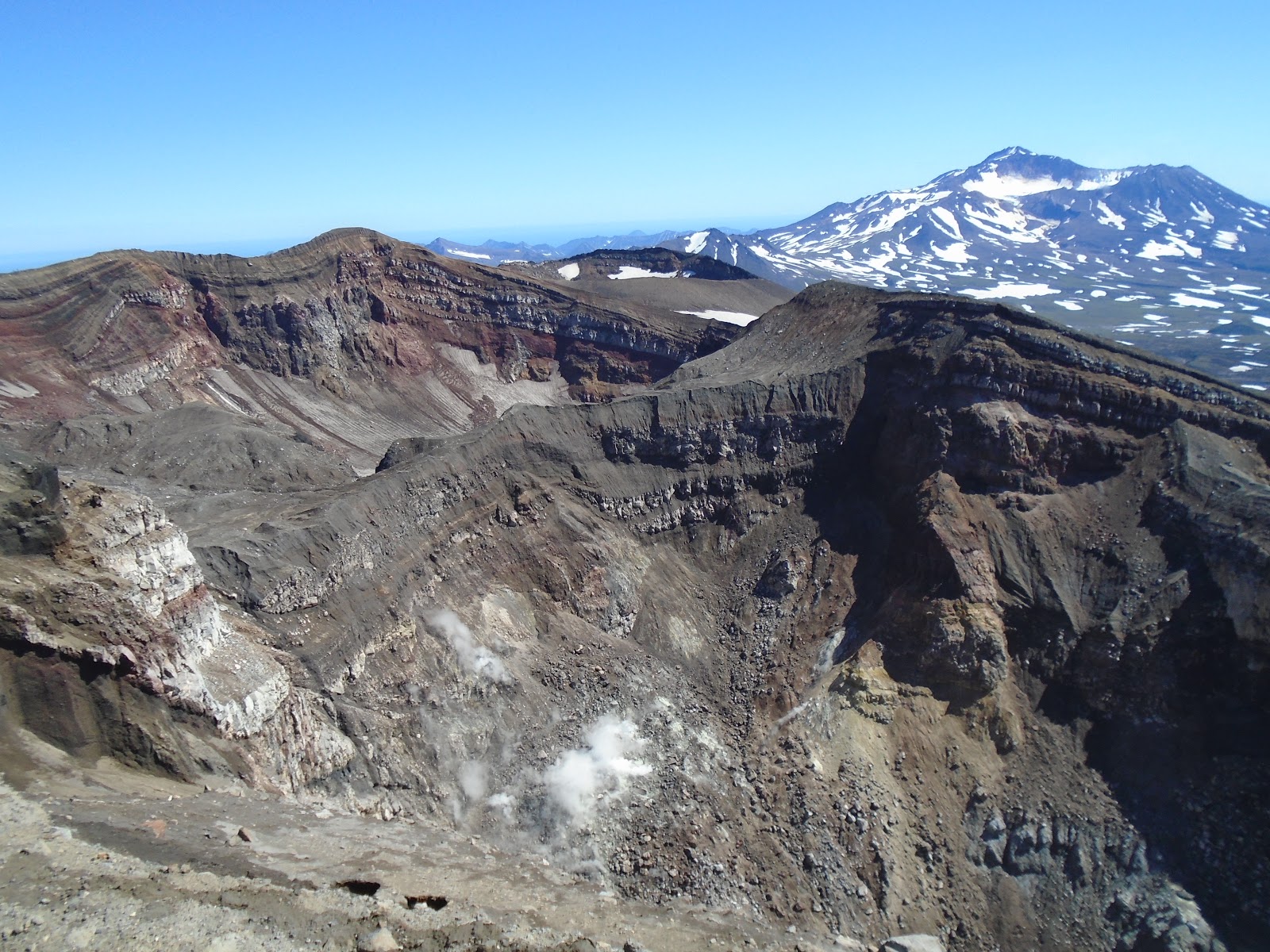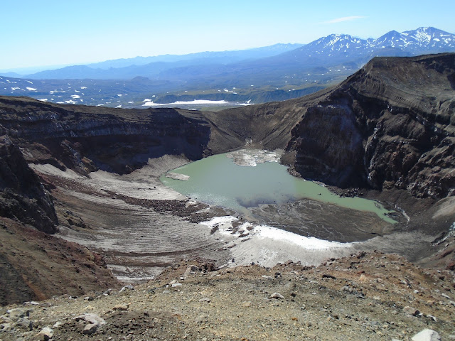 На дне кратера образовалось 2 озера: одно – холодное, побольше, другое – поменьше, горячее, парящее и воняющее сероводородом. Какой родной запах! А Вова единственный из нас спустился в кратер вулкана к холодному озеру.