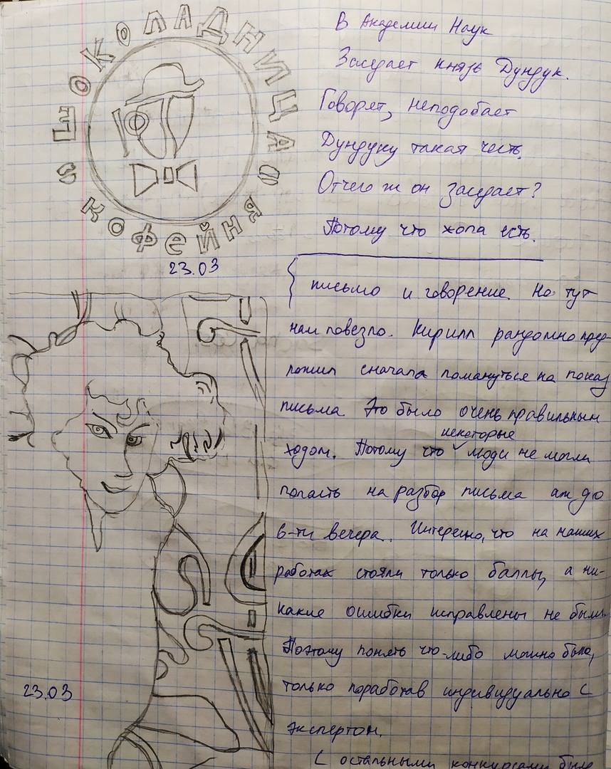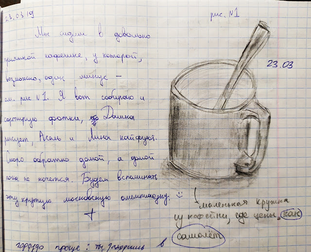 “23.03.19. Мы сидим в довольно приятной кафешке, у которой, возможно, один минус (всё стоит, как самолёт). Я вот сортирую фотки, Дашка рисует, Асель и Лина кайфуют. Скоро обратно домой, а домой пока не хочется. Будем вспоминать эту крутую московскую олимпиадку:))” – от Кирилла.