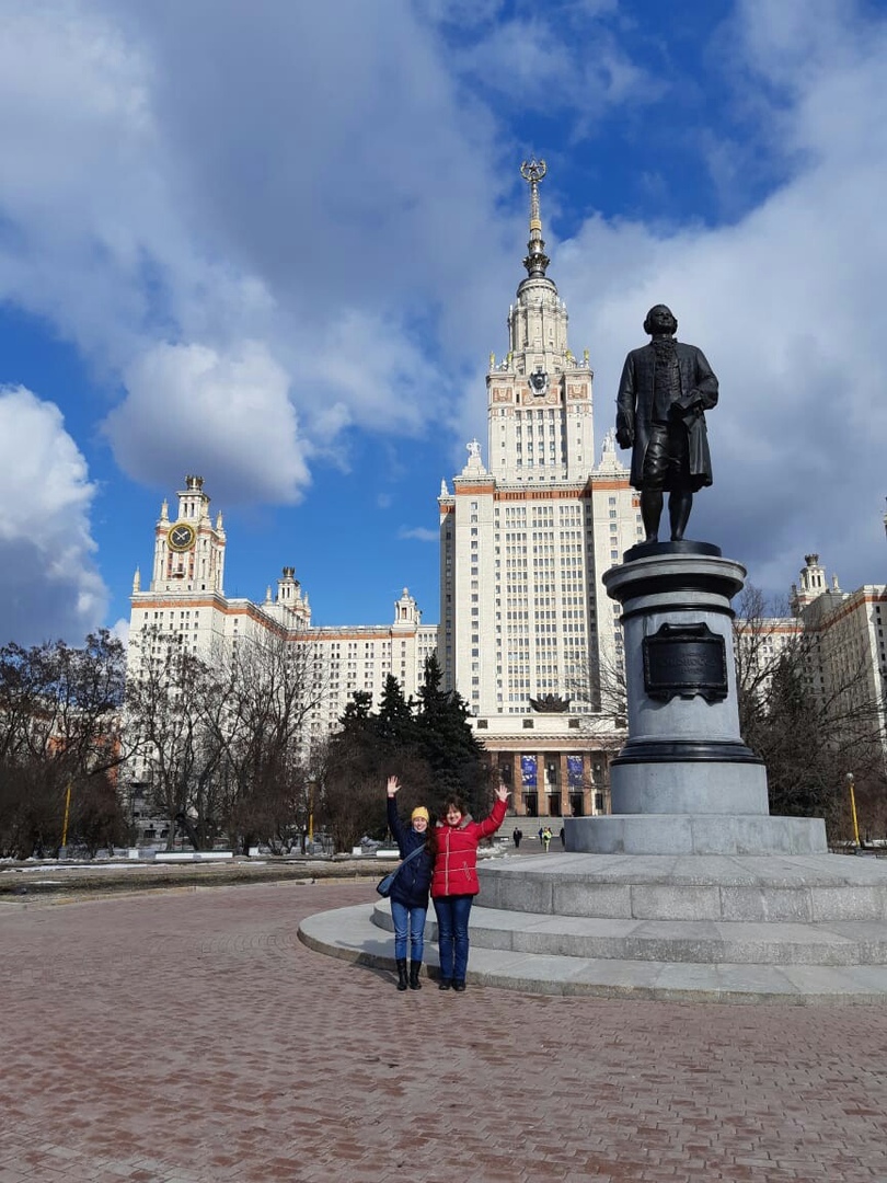Самолёт у нас в половине десятого вечера, такси заказано на половину шестого, а до этого часа – свободное время. Ребята пошли в Третьяковскую галерею, а я опять встречалась с Катей и Святославом. Мы погуляли по Воробьёвым горам, посмотрели на Москву при дневном свете и без тумана. Пусечка залез в фонтан и купался в сугробе. Мы с ним прыгали со ступенек около МГУ и делали прикольные фотки.