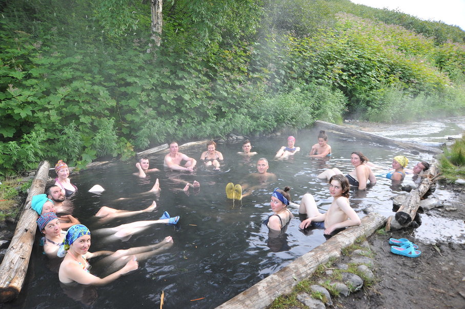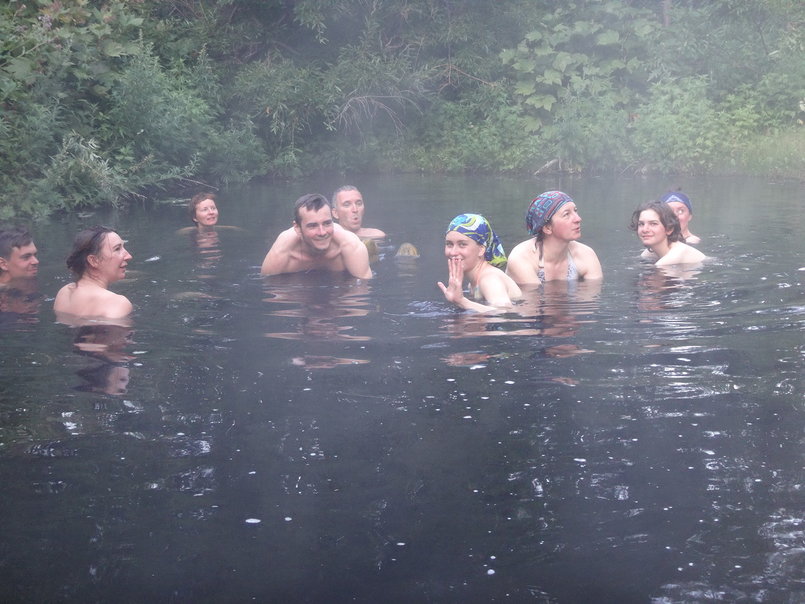На финише нас ожидало 2, гм, “ванны” с мутной водичкой. Одна – похолоднее, другая – погорячее, но обе мелкие и с обильным количеством ила на дне. Мы залегли в эти самые “ванны” и лежали там, радостно похрюкивая, – тепло, хорошо. Правда, полный купальник чёрного ила, но это ерунда. Мелочи жизни. Потом отмывались в ручейке при помощи кружек. Холодный брод после горячих луж принёс множество острых ощущений.
