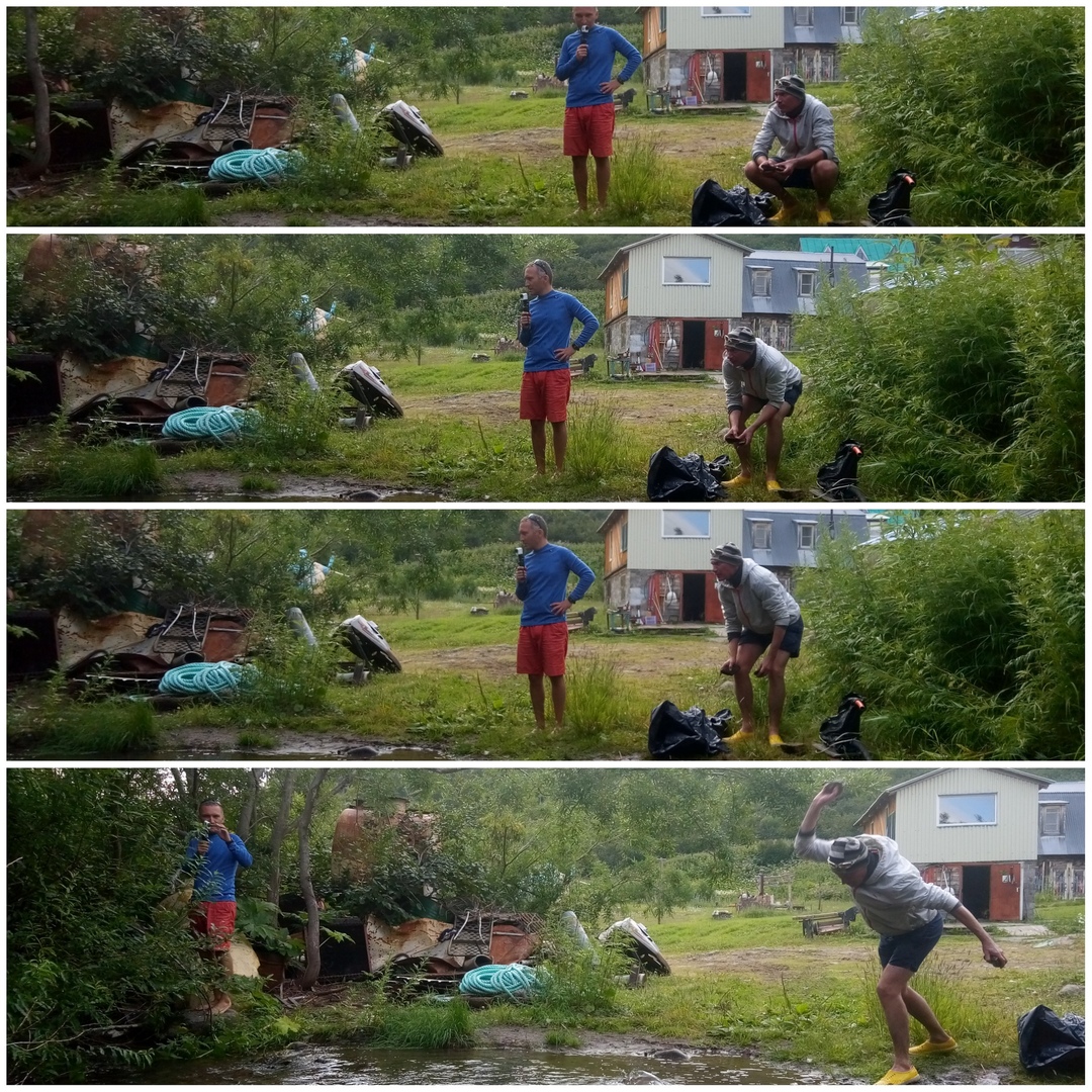 Обедали мы в 7 вечера. Была практически идиллия. Солнышко и спокойствие. В речке нерестится РЫБКА: кета, горбуша, лосось. Все дяденьки, в первую очередь Вова, очень азартно эту самую РЫБКУ ловили. Сколько эмоций-то! Экспрессия! Накал страстей! В общем, очень динамичный процесс.
