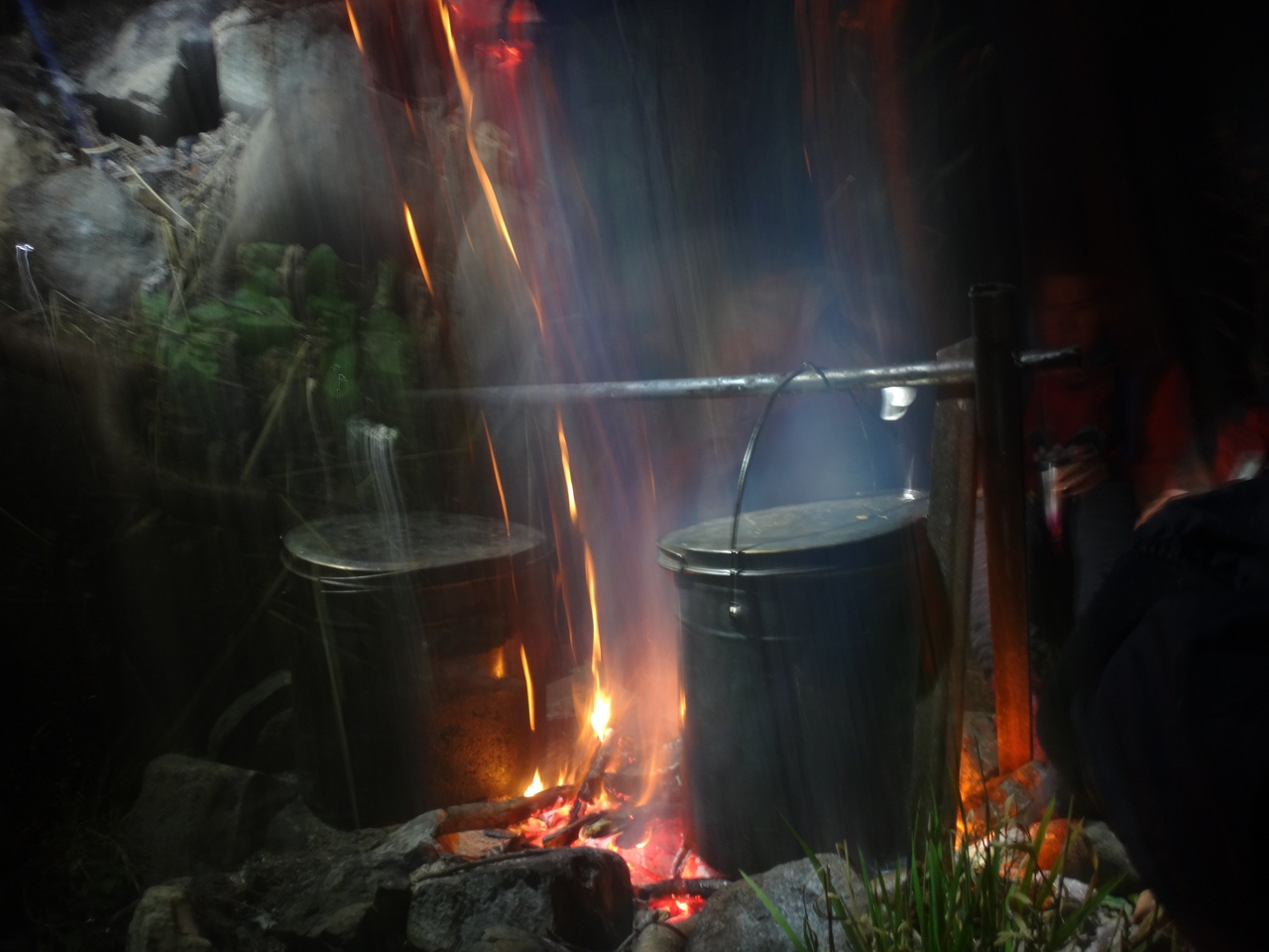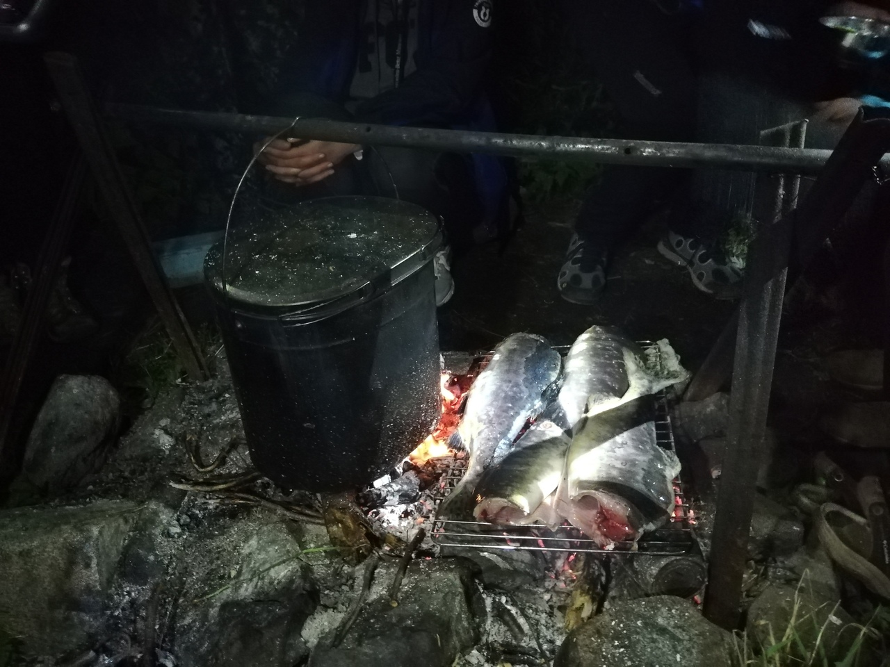 Совсем вечером мы готовили на костре ГРЕЧУ (нет, они серьёзно все говорят греча, и даже на пачке так написано!), а заядлые рыбаки продолжили свою охоту. Которая, кстати, увенчалась, наконец, успехом – теперь у нас есть 4 здоровенных рыбины (кета, если я не ошибаюсь), которых народ, шумно совещаясь, жарит на решётке на костре. А я объелась ГРЕЧЕЙ и уже ничего не хочу. Даже РЫБКУ не попробовала, вот тупая.