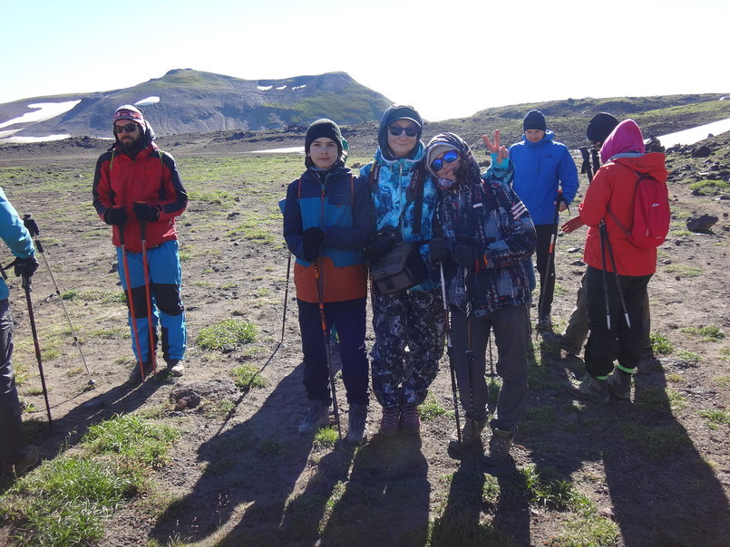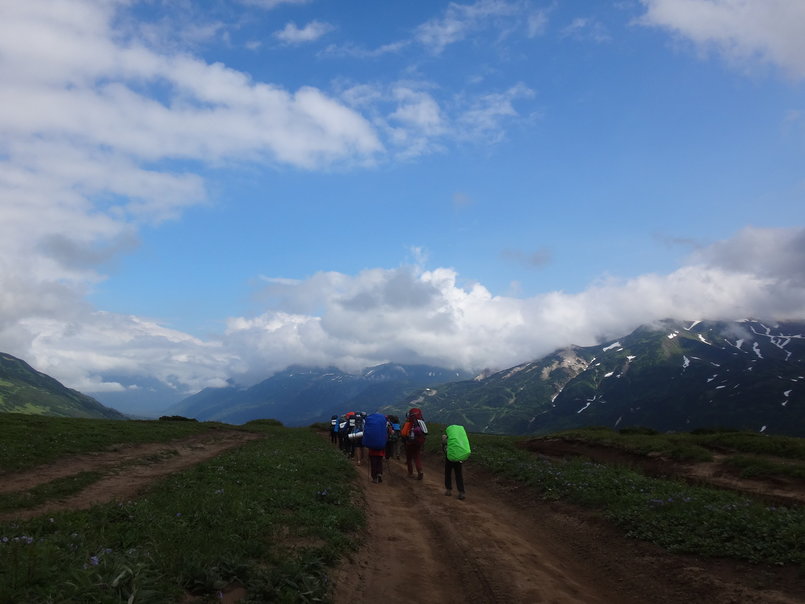 Шли мы сегодня 6 часов: сначала по автомобильной дороге (“другого пути там нет”), периодически отскакивая в сторону; потом – 5,5 км после поворота мы спускались до базы “Родниковая”. Всего прошли чуть больше 18ти км. Спускаться было тяжело из-за камней и грязи, и коленки устали. Зато долина очень красивая, здесь много-много зелени.