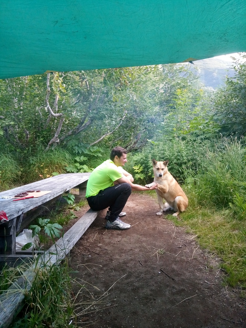 Правда, как следствие, и мишек здесь должно быть гораздо больше, чем под Горелым. Пока шли, почти всё небо затянуло тучами, а когда уже достигли цели, внезапно всё заголубело, и стало почти приятно. Мы заняли козырную стоянку с хорошими местами для палаток, с обустроенным костровищем и со столом с лавочками! А также здесь присутствует такое удобство, как туалет типа сортир. Вот это очень кстати.