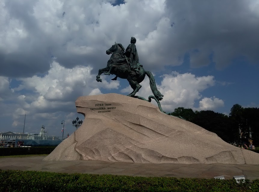 Потом мы перекусили в кафешке, где была длиннющая очередь, и всё стоило, как самолёт. Затем прогулялись по Дворцовой площади, посмотрели Эрмитаж и Александрийскую колонну, а также Атлантов, которые «небо держат на каменных руках».