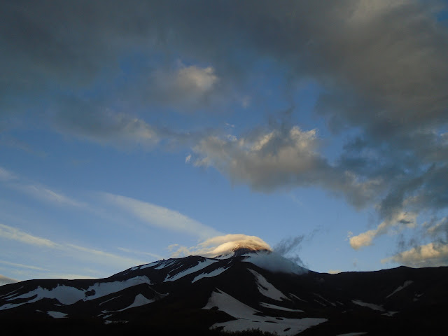 В 8 приехала вахтовка. Мы загрузились и покатили. Всю дороге в машине что-то угрожаще скрипело и визжало. “Скорее всего, всё” – верно отметил Вася. На подъездах к цивилизации появились связь и даже интернет, и народ тутже залип. Ну всё, мы потеряли людей, придётся покупать новых. Да, едем-то мы к подножию Авачинского вулкана! А на завтра запланировано восхождение. По пути заезжаем в магазин и затариваемся всякой разной гадостью типа чипсов. Ещё часа через полтора мы были уже на месте. Кстати, сегодня, оказывается, день Авачинского вулкана, поэтому здесь тьма-тьмущая народу. Воды здесь нет. Растительность есть, но очень скудая – какие-то унылые кустики. Роботов нет. К счатью, на данный момент нет ни дождя, ни ветра, поэтому мы спокойно поставили палатки и разложились. Попытались начать варить обед. Ничего не вышло, поскольку обеда 10-го дня мы не обнаружили. Кто-то спёр. Пришлось варить половину ужина, есть его и ложиться спать. Побатонились до 6-ти часов, потом сварили и съели ужин – вторую половину ужина, и пошли гулять по окрестностям. Авачинский вулкан ненадолго показал нам свою вершину, и была красотенюшка.