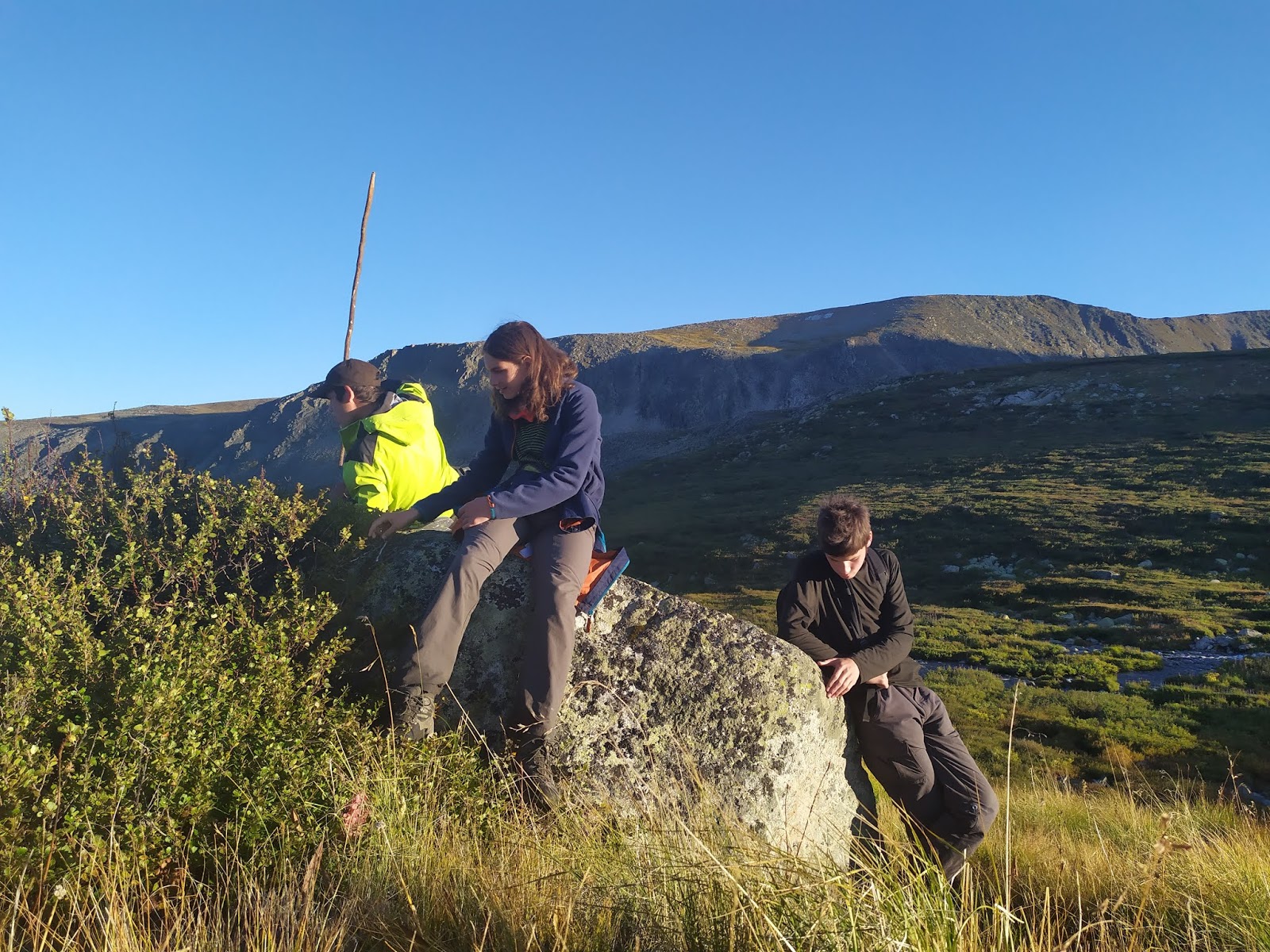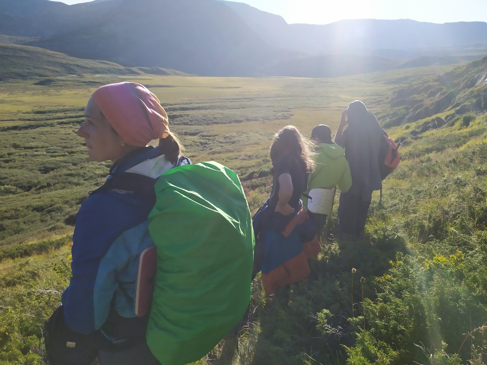 За эти 4.5 часа мы пережили все лишения и претерпевания, какие только можно себе вообразить. Шли по болоту, по отвратительно мягкому мху, который ненадёжно пружинил под ногами, продирались через густые заросли карликовой берёзы, ползли вверх по крутому склону, плавно спускались вниз по другой стороне того же склона, снова плюхали по болоту. А ещё были всевозможные комбинации всего вышеперечисленного. Мальчики нудились и сетовали на несовершенство этого мира, а я старалась сохранять позитивный взгляд на происходящее безумие. И ведь это же всё добровольно! Никто же не заставлял! Дурка по нам плачет.