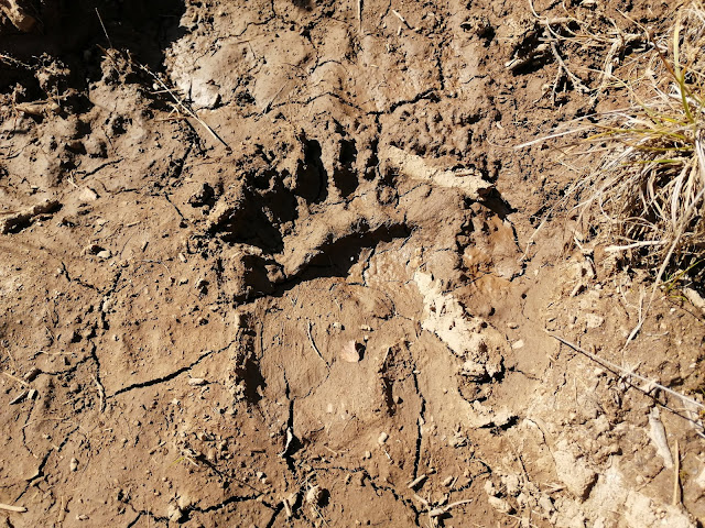 Кроме того, довольно долго нас сопровождала цепочка медвежьих следов, что, естественно, не могло нас не обеспокоить. Мы с Пашей орали “Всё идёт по планууу-у” и “С Первомаем, дорогая…” с целью напугать мишку. Скорее всего, получилось, ибо дуэт у нас такой себе.