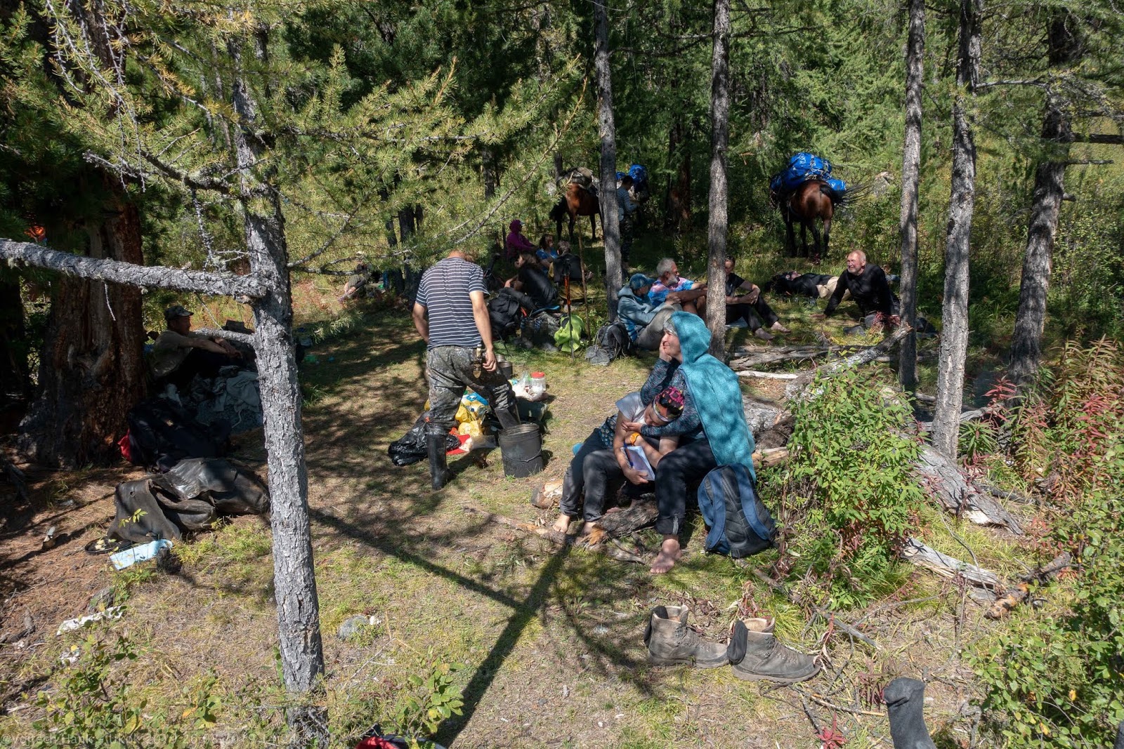 Сегодня мы так сильно спустились, что обратно достигли зоны леса. Обедали в очень живописном месте на берегу какого-то безымянного озера. Было тепло, светло, по-доброму и умиротворённо.