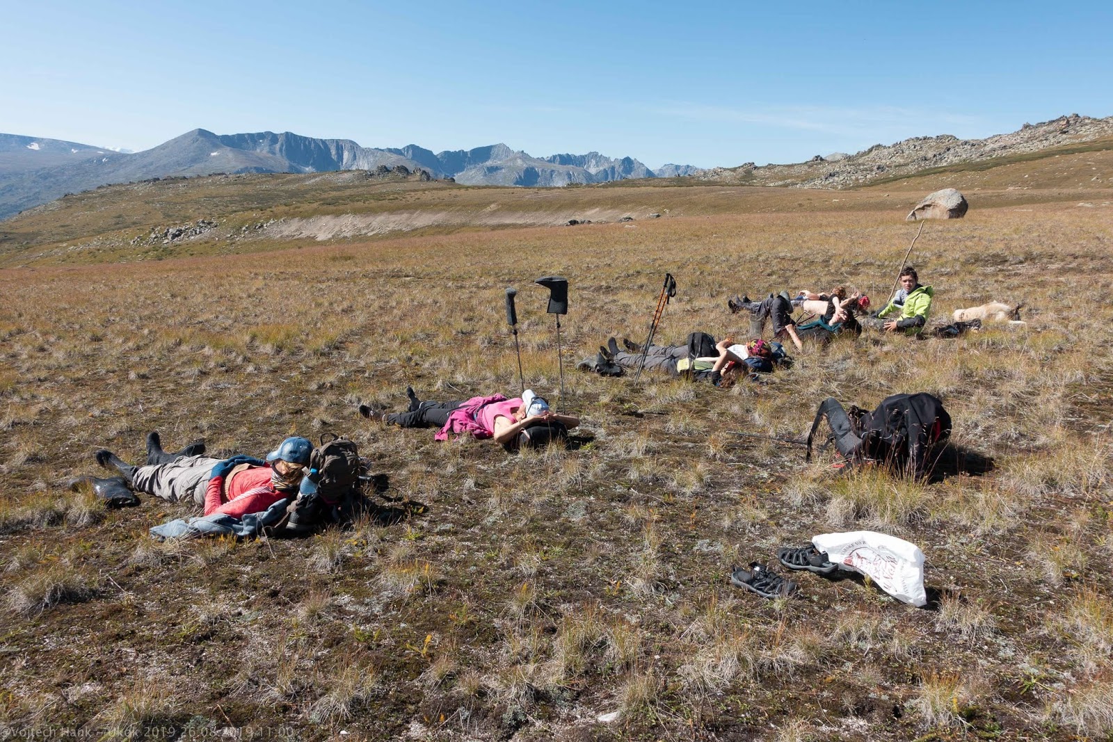 До места стоянки наша передовая группа (беговые лоси – так нас Света Ч называет) добежала к шести вечера. До озера мы всё-таки не дошли. На этой стоянке почти что есть лес, а ручей располагается в 50ти Диминых метрах, то есть прилично так далеко. Сегодня я научила обниматься ещё одного человека – это Ира из Москвы. Отлично, ещё +1!