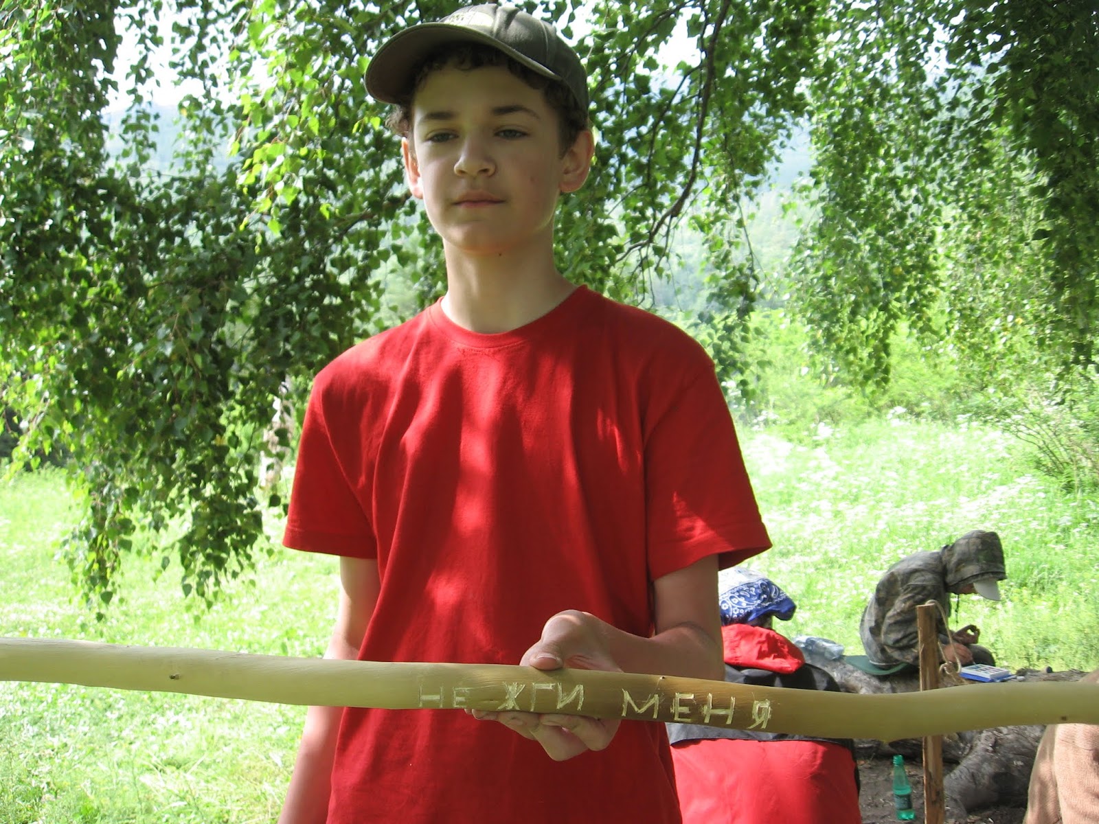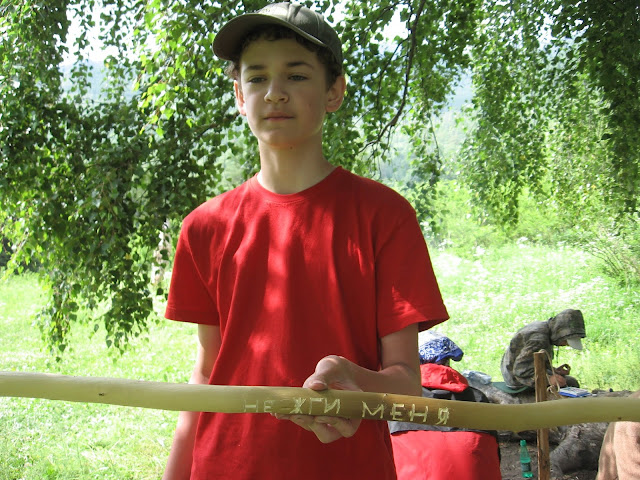 Но и лошадей Дима не отменил – забыл. Мы сидим такие, собранные уже, а тут приходят 3 лошади. Дима развернул их на 180 градусов и отправил назад. Пока мы ждали машину, каждый делал кто что. Ваня с Тёмой вырезали на нашей костровой палочке “Не жги меня!”. Кстати, они эту палочку с собой забрали.