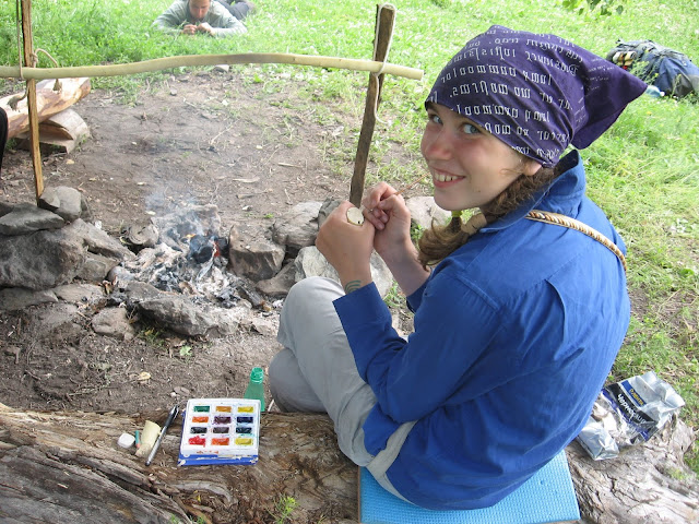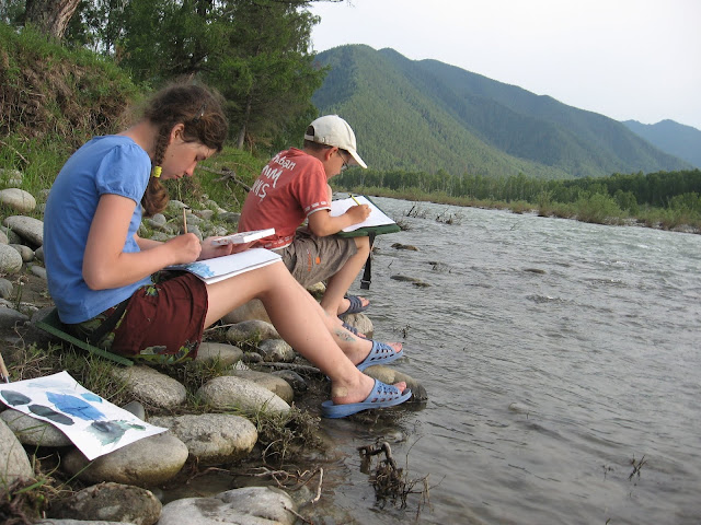 Потом мне это всё надоело, и мы с т. Машей пошли к хозяйке базы за мёдом и листками для рисования. Купили по 1.5 кг мёда, получили листы, и я опять пошла к Катуни – на этот раз рисовать. Недолго со мной сидел Яха. Он нарисовал карандашом какого-то кривого кота и ушёл. А я сидела довольно долго, потому что бумага была не акварельная, и краски растекались. А ещё я чуть не утопила свою акварель в Катуни, но успела всё выловить.