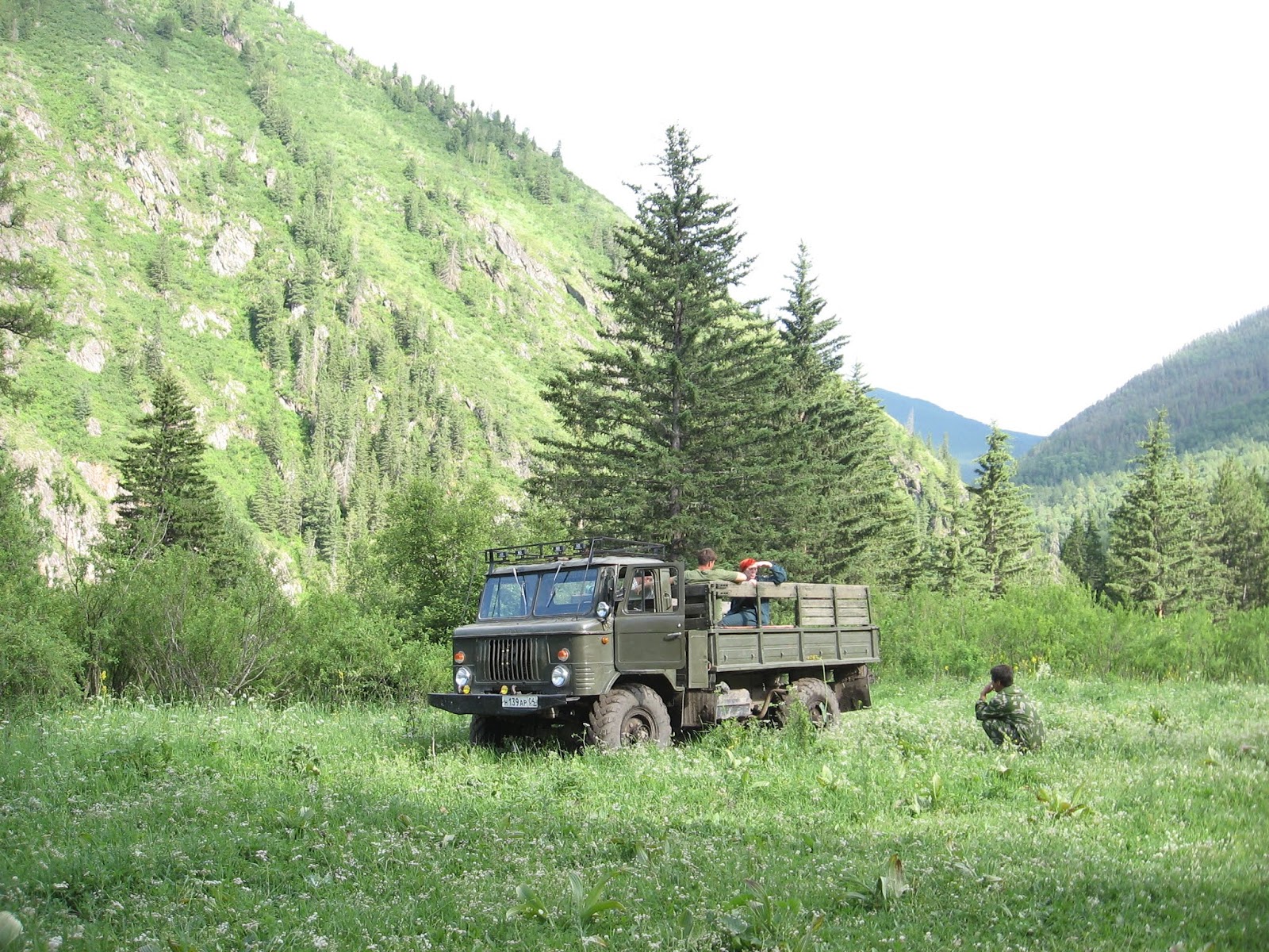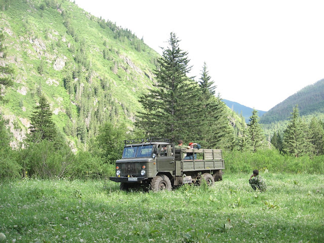 Сегодня у нас планировался переход через перевал Кузуяк налегке, а рюкзаки бы поехали на лошадях. Но вчера мы встретили ГАЗ 66 (построили мост), который сказал: “Чего пешком, давайте поехали!” В результате договорились до того, что сегодня за нами должна приехать машина.