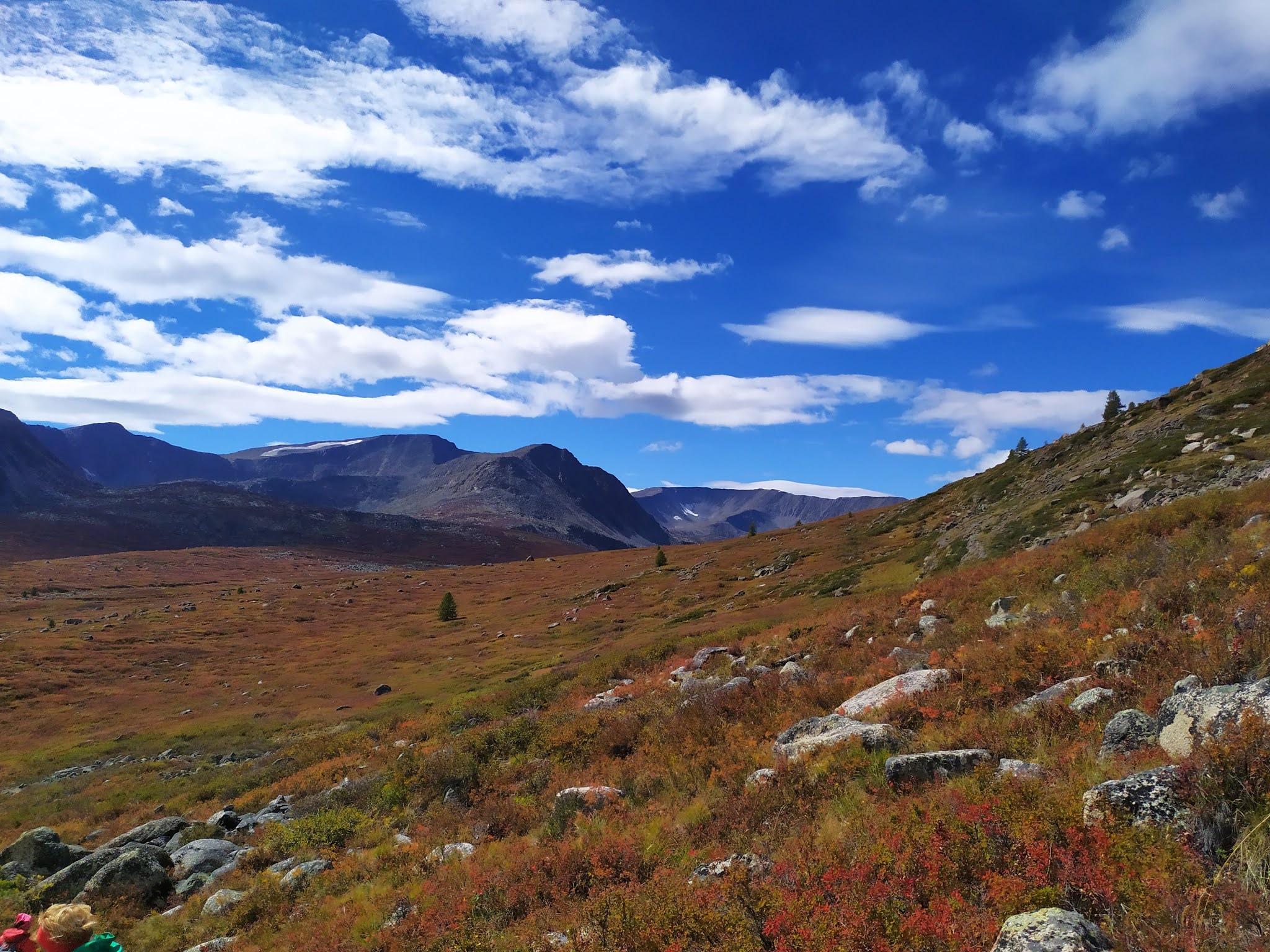 Чем выше мы поднимались – тем обширнее и богаче становились открывающиеся нашему взору перспективы. Весёлый ветер мерно колыхал красное море карлушки и золотисто-жёлтое – травы, раскачивал пушистые изумрудно-зелёные ветки кедров, освежал мысли в голове. По небу плыли облака самых причудливых форм и оттенков, из-за чего краски осени казались ещё более насыщенными.